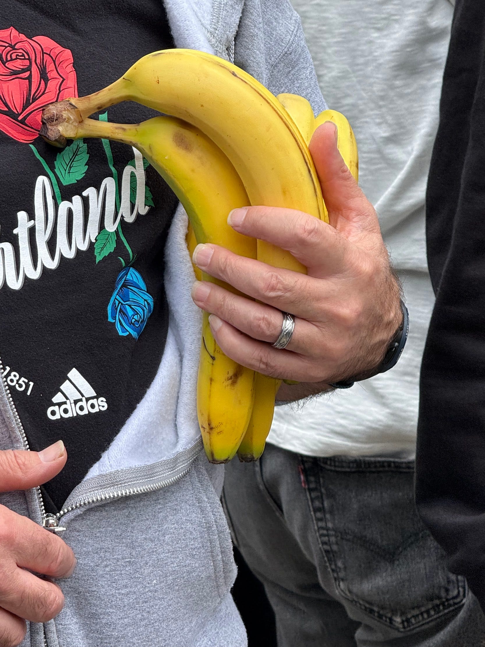 Clearly this protester had paid attention to the Congressional hearing last week, during which Howard Lutnick had his banana handed to him on a platter.
