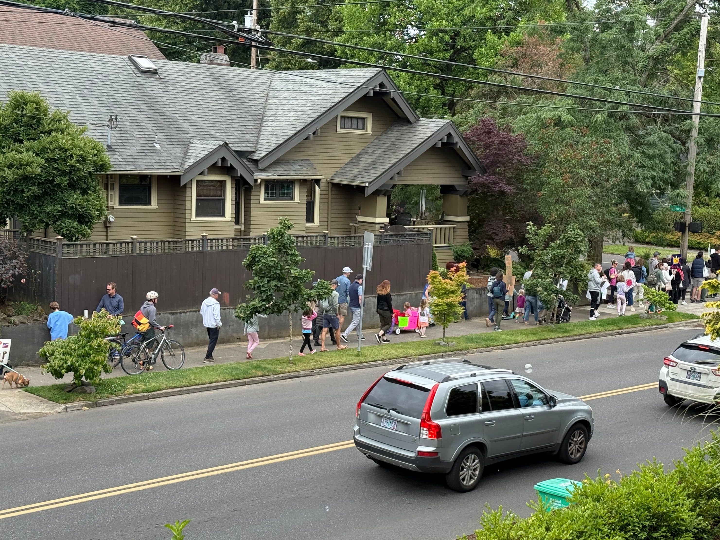 It was totally sweet to see so many multi-generational families going by. These parents are bringing their kids up right (or, as the MAGA folks would say, they’re “grooming” their kids). At the end of this parade of probably a couple hundred people, a family with two kids had five-gallon plastic buckets with them and those squeezee sticks that you use to pick up things, and they were picking up all the litter along the way.