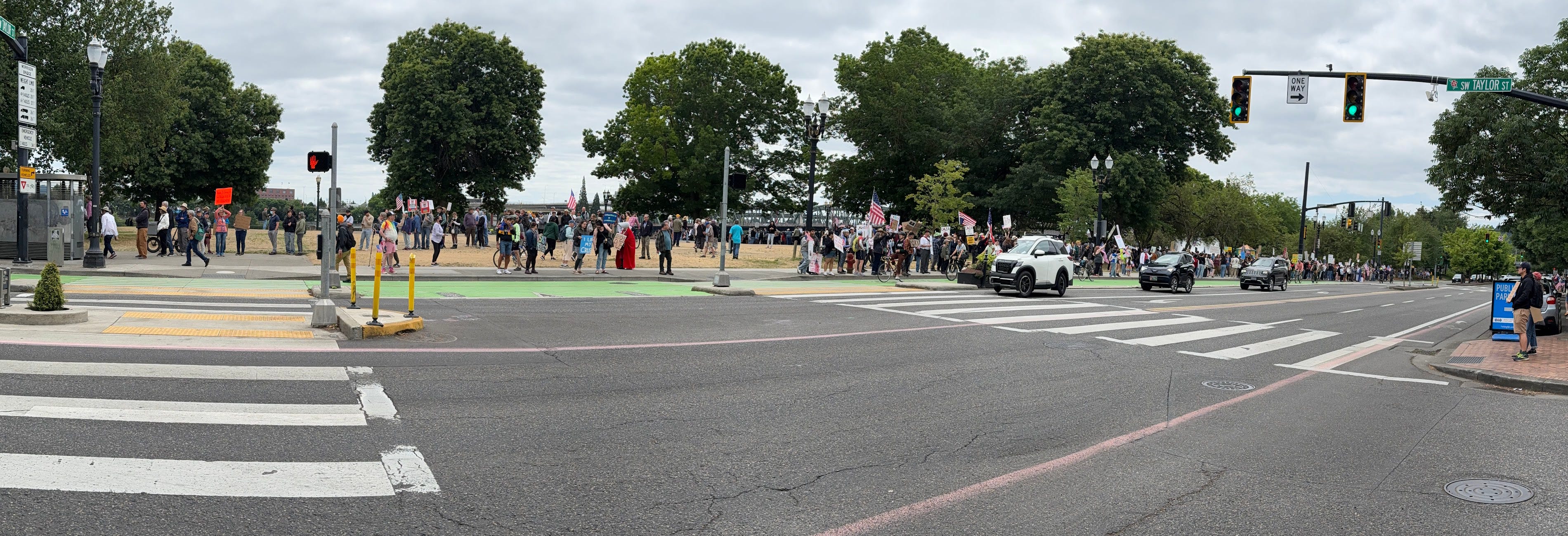 Here in Portland, the protests found me before I even made an effort to get to the protests. I heard the dog barking and some horns honking outside. I looked out the front window and saw a “Families Against Fascism” march going by: