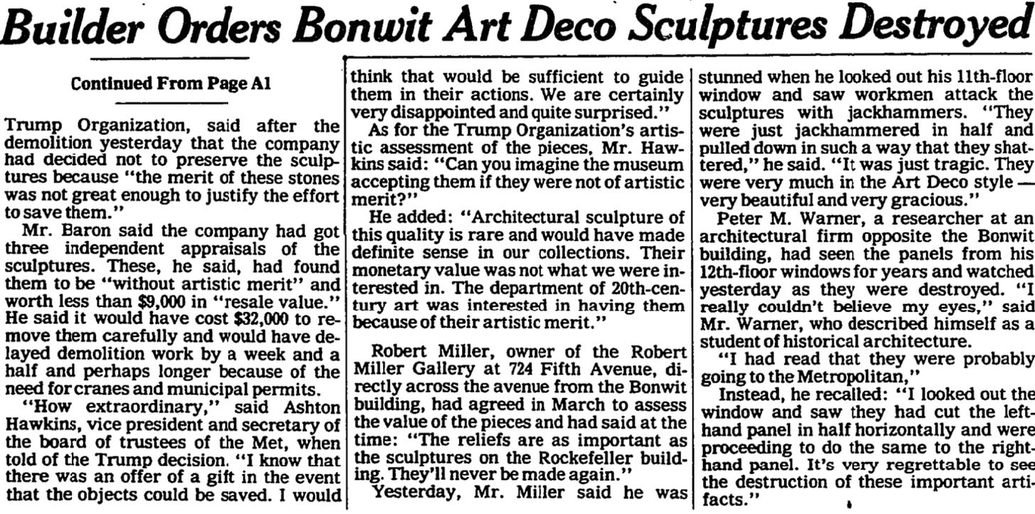 But Donald Trump’s word, even in duly executed legal documents, was as worthless then as it is now. Despite his promises, the sculptures were destroyed by his construction crew on June 5, 1980. But John Baron, Trump’s imaginary friend/alter ego and fake VP of the Trump Organization, gave the New York Times the flimsy excuse that it would cost $32,000 of the $100 million budget for the Trump Tower itself to save them. (That $32K was probably pulled out of his backside, too.)