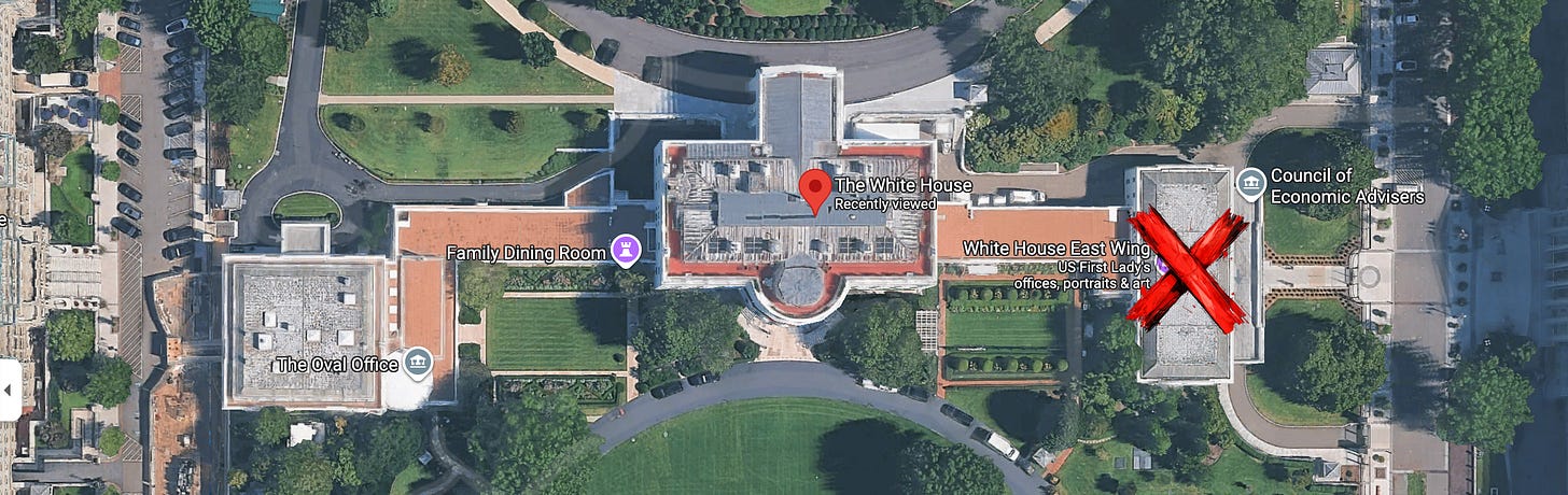 For purposes of discussion, let’s pretend that this vanity project has a legitimate purpose. Let’s ignore the abject tackiness of the renovations that he’s done to the other parts of the White House and that he intends to impose on this ballroom of his. Let’s also stipulate for this discussion that there was a legitimate reason to engage in some demolition or renovation of the East Wing in order to accomplish his objective of constructing a ballroom and providing access to it from the existing structures. There are ways to accomplish those objectives that don’t involve lying to the American public and destroying a beloved landmark.