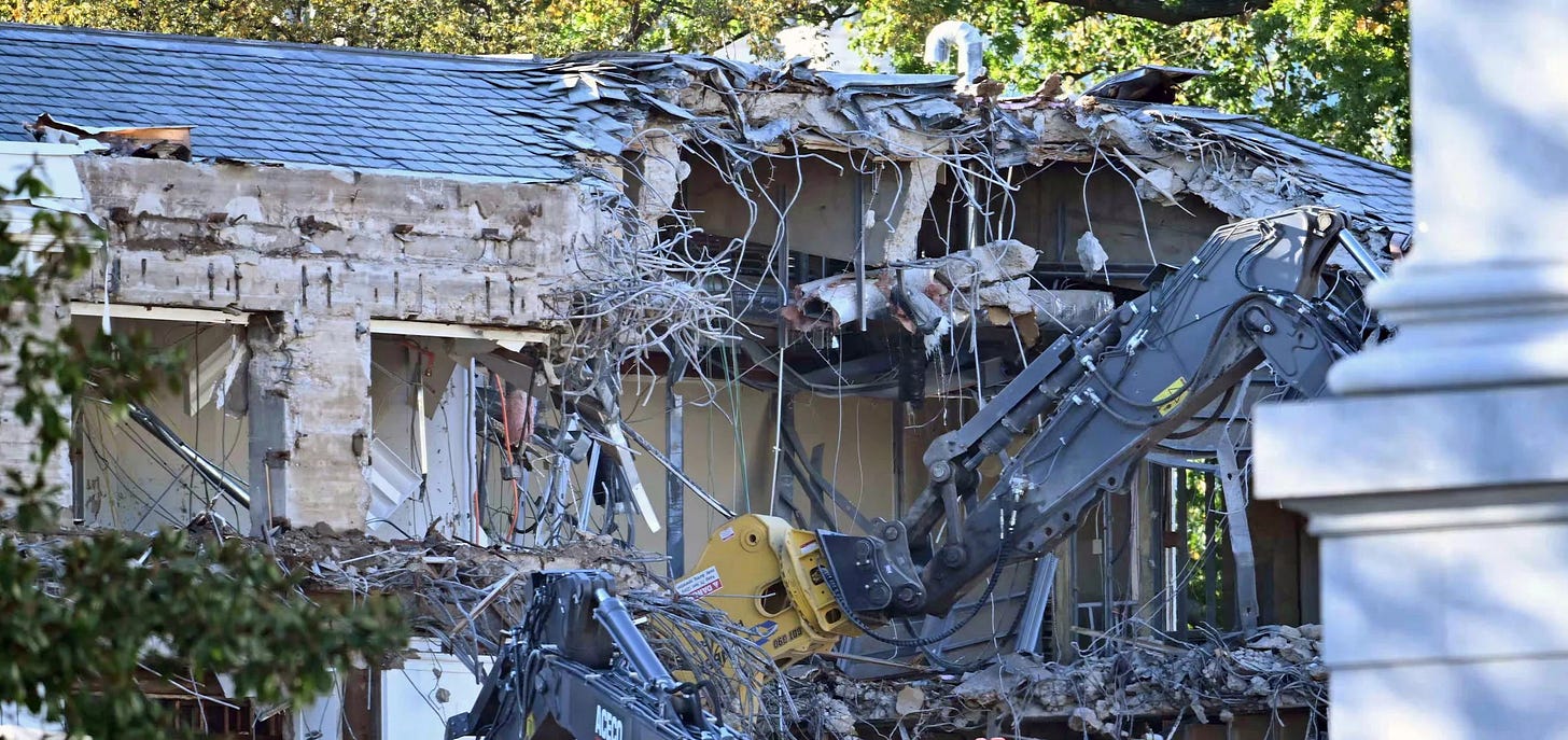 Oh, hell, no. His inflated ego told him he didn’t have to do any of that. Those rules and norms are for other people. Instead, he first lied to the American people that the East Wing would remain intact. Almost immediately, excavators showed up and began demolition with no notice. Then — perhaps when it was already obvious — he announced that the entire East Wing is being destroyed.