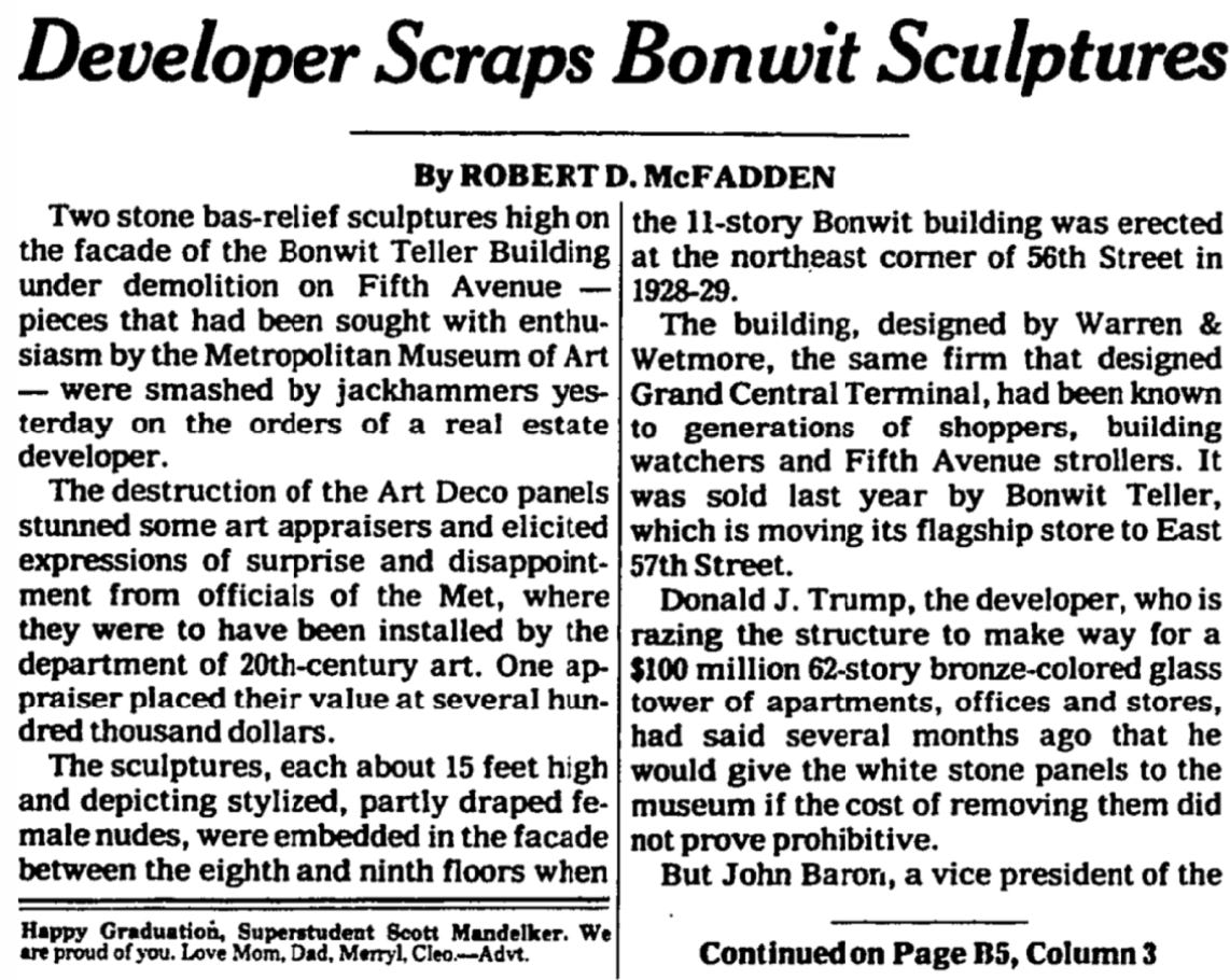 Trump Tower was built on the site of the Bonwit Teller building, a fashionable department store on the corner of 57th Street and Fifth Avenue that was constructed in 1929. The façade of that building contained two art deco bas-relief stone sculptures of architectural and historic significance. Preservationists in New York City had an agreement with Donald Trump to save those sculptures; they were to be donated to the Metropolitan Museum of Art.