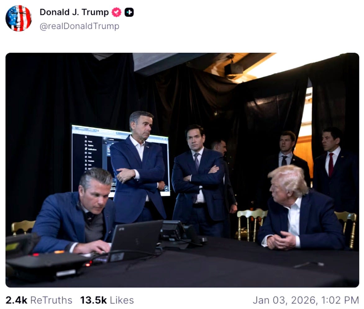 Where was this picture taken? Is this some store room at Mar-A-Lago? Tru[mp couldn’t be bothered to return to Washington to the White House Situation Room for a matter of such gravity? The casualness with which he has approached the unlawful removal of the leader of a supposedly sovereign nation is shocking, even for Trump, who has single-handedly changed our collective understanding of what can shock us.